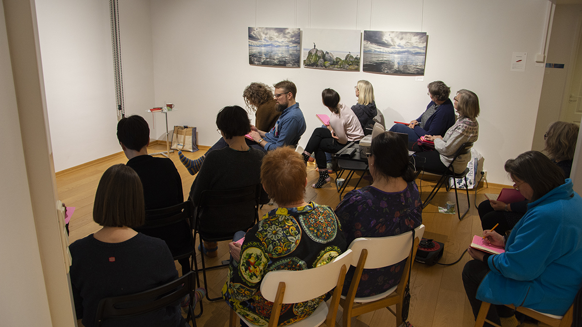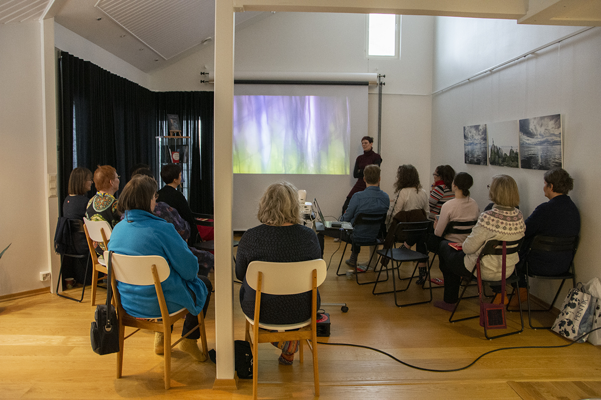 Luovan lauantain reseptiin kuuluivat alustukset,  jotka virittivät Villa Vinkkelin villasukkiin sonnustautuneet kynäilijät iltapäivän teemaan. Valokuvaaja Kaisa Sirén kertoi omasta inspiroitumisestaan ja saimme ihastella taidekuvia, videoita ja äänimaisemia Kaisan kuvausreissuilta.